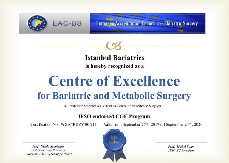 Morbid obezite ve metabolik hastalıklarla karşılaşmış bireylere verilecek tedavilerin kalitesinin arttırılması ve belli bir standartta olması için ameliyat öncesi ve sonrasını yönetecek cerrahi ekibin tecrübesinin yanı sıra multidisipliner tam donanımlı bir kliniğin tanımlanması ve yeterliliğinin ölçülmesi bir gereklilik olarak doğmuştur. Bu amaç doğrultusunda, Uluslararası Obezite Cerrahi Federasyonu (IFSO), ulusal ve bölgesel mükemmellik merkezlerine gerekli kuralların oluşturulmasında yardımcı olacak European Accreditation Council for Bariatric Surgery (EAC-BS) konseyini oluşturmuştur. Bu komite, belli kriterleri karşılayıp federasyona başvuran, uzun bir denetleme sürecinden sonra da belli kriterlere sahip olduğunu gösteren ve sadece ameliyat sürecinde değil ameliyat sonrasında da hastalara takip ve tedavi açısından destek verdiğini kanıtlayan klinik ve cerrahları belgelendirmek için bir program başlatmıştır. Bu “Mükemmelliyet Merkezi” sertifikasyon programını başarıyla tamamlayarak belge almaya hak kazanan Türkiye’deki tek özel klinik İstanbul Bariatrics olmuştur.